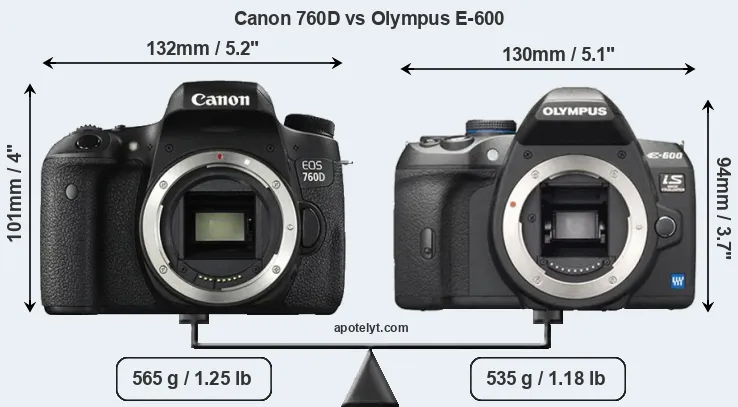 An illustration of the physical size and weight of the Canon 760D and the Olympus E-600 is provided in the side-by-side display below. The two cameras are presented according to their relative size. Three successive views from the front, the top, and the rear are shown. All width, height and depth measures are rounded to the nearest millimeter.