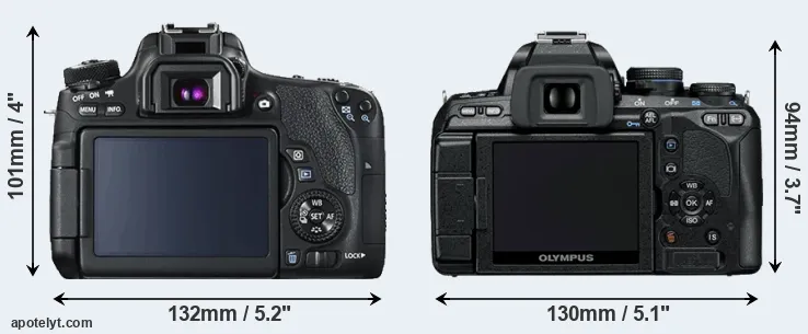 Going beyond this snapshot of core features and characteristics, what are the differences between the Canon EOS 760D and the Olympus E-600? Which one should you buy? Read on to find out how these two cameras compare with respect to their body size, their imaging sensors, their shooting features, their input-output connections, and their reception by expert reviewers.