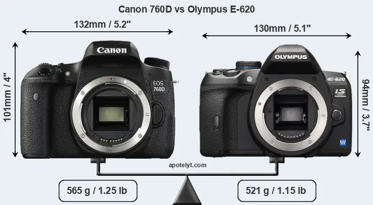 An illustration of the physical size and weight of the Canon 760D and the Olympus E-620 is provided in the side-by-side display below. The two cameras are presented according to their relative size. Three successive views from the front, the top, and the rear are shown. All width, height and depth measures are rounded to the nearest millimeter.