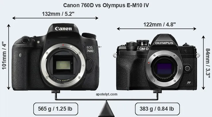 If the front view area (width x height) of the cameras is taken as an aggregate measure of their size, the Olympus E-M10 IV is notably smaller (23 percent) than the Canon 760D. Moreover, the E-M10 IV is markedly lighter (32 percent) than the 760D. In this context, it is worth noting that neither the 760D nor the E-M10 IV are weather-sealed.
