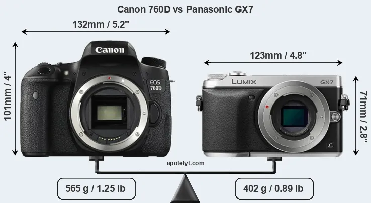 If the front view area (width x height) of the cameras is taken as an aggregate measure of their size, the Panasonic GX7 is considerably smaller (34 percent) than the Canon 760D. Moreover, the GX7 is markedly lighter (29 percent) than the 760D. In this context, it is worth noting that neither the 760D nor the GX7 are weather-sealed.