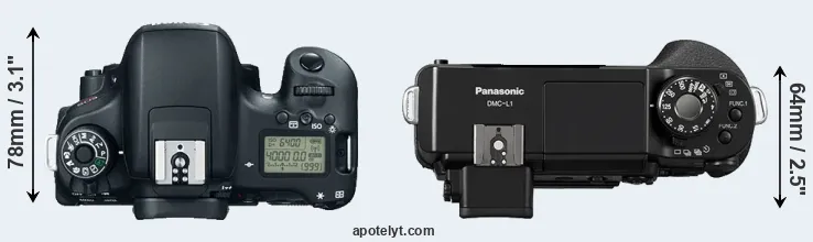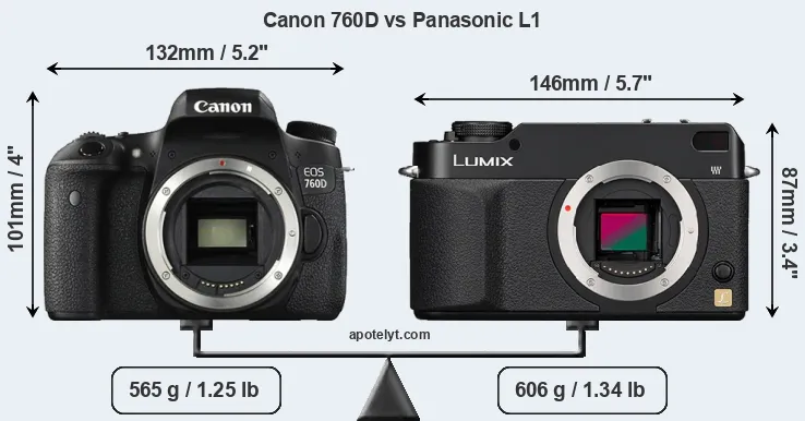 The side-by-side display below illustrates the physical size and weight of the Canon 760D and the Panasonic L1. The two cameras are presented according to their relative size. Three successive views from the front, the top, and the rear are shown. All width, height and depth measures are rounded to the nearest millimeter.