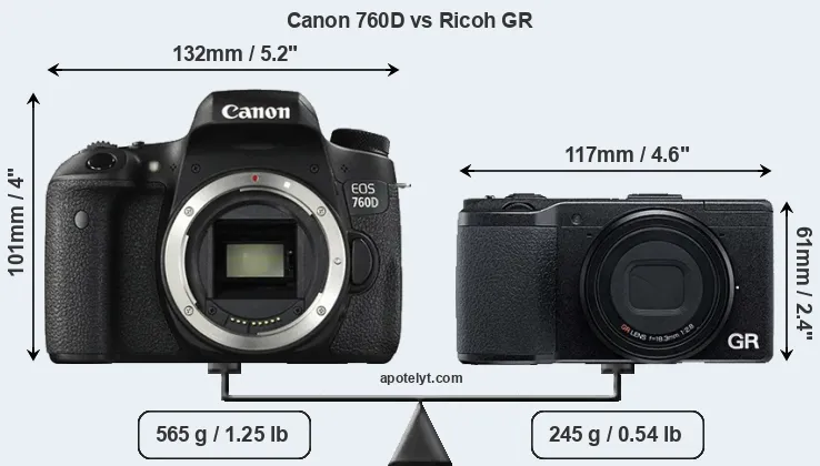 An illustration of the physical size and weight of the Canon 760D and the Ricoh GR is provided in the side-by-side display below. The two cameras are presented according to their relative size. Three successive views from the front, the top, and the rear are shown. All size dimensions are rounded to the nearest millimeter.