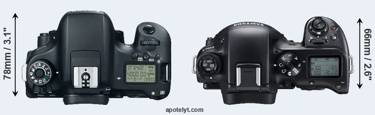 The side-by-side display below illustrates the physical size and weight of the Canon 760D and the Samsung NX1. The two cameras are presented according to their relative size. Three consecutive perspectives from the front, the top, and the back are available. All width, height and depth dimensions are rounded to the nearest millimeter.