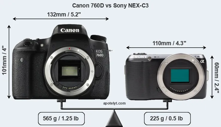 The side-by-side display below illustrates the physical size and weight of the Canon 760D and the Sony NEX-C3. The two cameras are presented according to their relative size. Three successive views from the front, the top, and the rear are shown. All width, height and depth dimensions are rounded to the nearest millimeter.