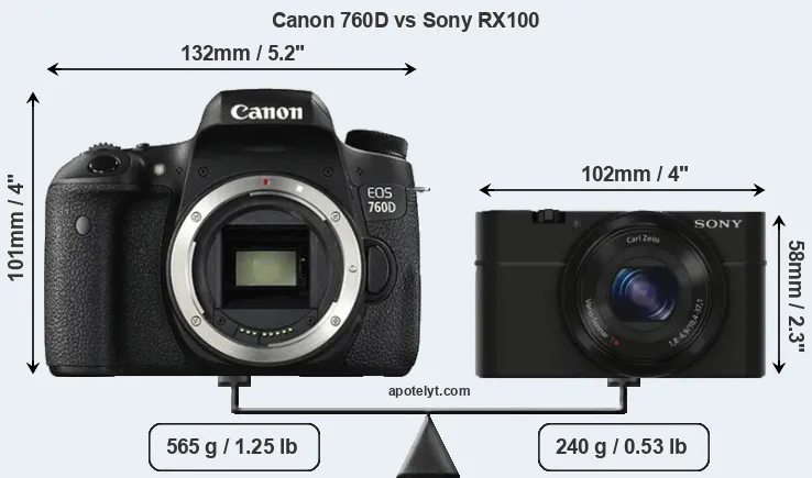 The physical size and weight of the Canon 760D and the Sony RX100 are illustrated in the side-by-side display below. The two cameras are presented according to their relative size. Three consecutive views from the front, the top, and the rear side are shown. All width, height and depth dimensions are rounded to the nearest millimeter.
