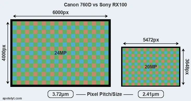 With 24MP, the 760D offers a higher resolution than the RX100 (20MP), but the 760D nevertheless has larger individual pixels (pixel pitch of 3.72μm versus 2.41μm for the RX100) due to its larger sensor. Moreover, the 760D is a much more recent model (by 2 years and 8 months) than the RX100, and its sensor will have benefitted from technological advances during this time that further enhance the light gathering capacity of its pixels.