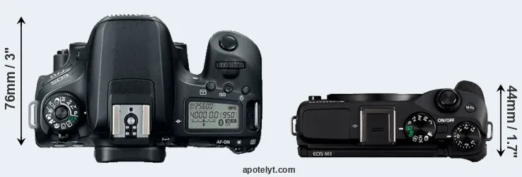 The physical size and weight of the Canon 77D and the Canon M3 are illustrated in the side-by-side display below. The two cameras are presented according to their relative size. Three consecutive perspectives from the front, the top, and the back are available. All size dimensions are rounded to the nearest millimeter.