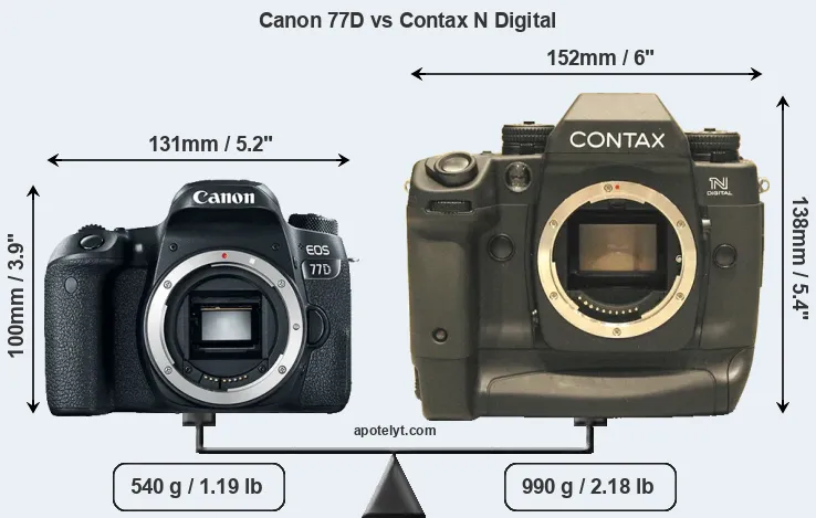 If the front view area (width x height) of the cameras is taken as an aggregate measure of their size, the Contax N Digital is considerably larger (60 percent) than the Canon 77D. Moreover, the N Digital is substantially heavier (83 percent) than the 77D. In this context, it is worth noting that neither the 77D nor the N Digital are weather-sealed.