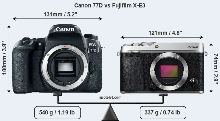 The physical size and weight of the Canon 77D and the Fujifilm X-E3 are illustrated in the side-by-side display below. The two cameras are presented according to their relative size. Three consecutive views from the front, the top, and the rear side are shown. All width, height and depth measures are rounded to the nearest millimeter.