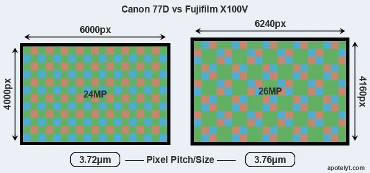 | Sensor Specs | Canon 77D | Fujifilm X100V |