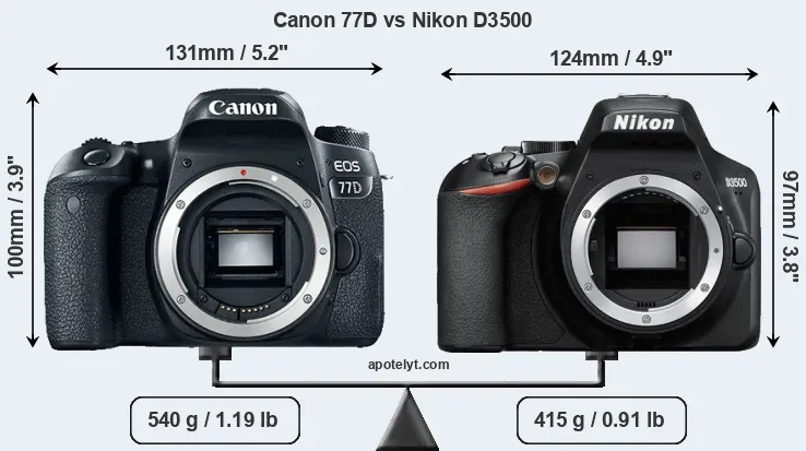 The physical size and weight of the Canon 77D and the Nikon D3500 are illustrated in the side-by-side display below. The two cameras are presented according to their relative size. Three consecutive perspectives from the front, the top, and the back are available. All size dimensions are rounded to the nearest millimeter.