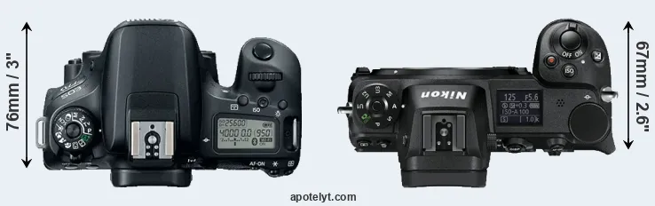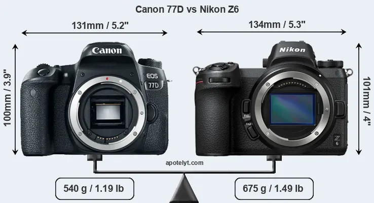 The side-by-side display below illustrates the physical size and weight of the Canon 77D and the Nikon Z6. The two cameras are presented according to their relative size. Three consecutive perspectives from the front, the top, and the back are available. All width, height and depth measures are rounded to the nearest millimeter.