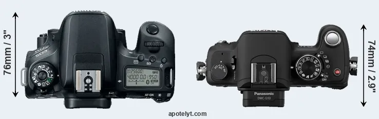 An illustration of the physical size and weight of the Canon 77D and the Panasonic G10 is provided in the side-by-side display below. The two cameras are presented according to their relative size. Three consecutive views from the front, the top, and the rear side are shown. All width, height and depth dimensions are rounded to the nearest millimeter.