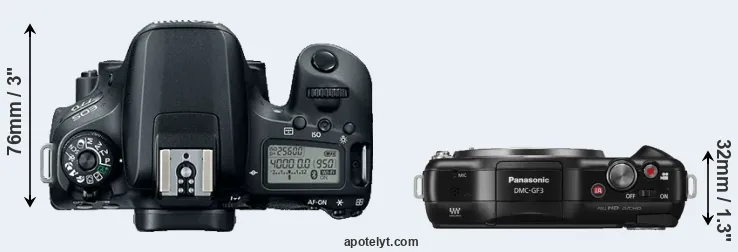 The side-by-side display below illustrates the physical size and weight of the Canon 77D and the Panasonic GF3. The two cameras are presented according to their relative size. Three consecutive views from the front, the top, and the rear side are shown. All size dimensions are rounded to the nearest millimeter.
