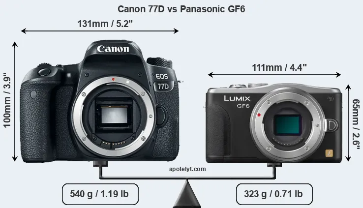 The side-by-side display below illustrates the physical size and weight of the Canon 77D and the Panasonic GF6. The two cameras are presented according to their relative size. Three successive views from the front, the top, and the rear are shown. All size dimensions are rounded to the nearest millimeter.