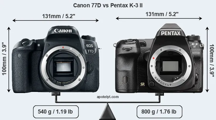 In this particular case, the Canon 77D and the Pentax K-3 II have exactly the same width and height, and, thus, have identically-sized bodies. However, the Pentax is substantially heavier (48 percent) than the Canon. It is noteworthy in this context that the K-3 II is splash and dust-proof, while the 77D does not feature any corresponding weather-sealing.