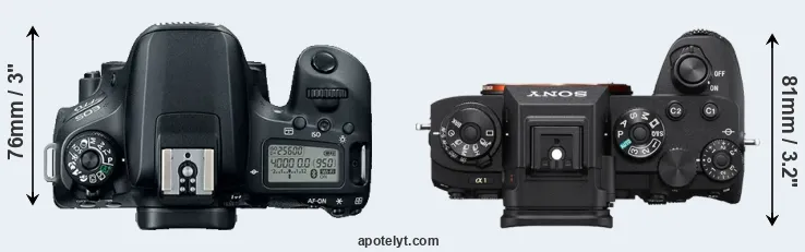 The side-by-side display below illustrates the physical size and weight of the Canon 77D and the Sony A1. The two cameras are presented according to their relative size. Three consecutive views from the front, the top, and the rear side are shown. All width, height and depth dimensions are rounded to the nearest millimeter.