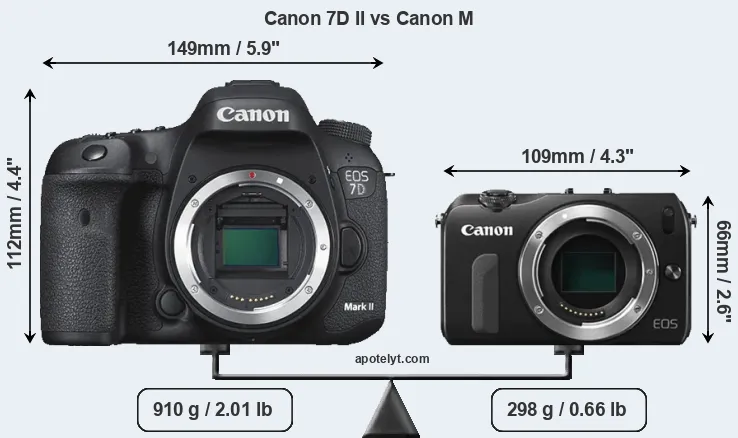 If the front view area (width x height) of the cameras is taken as an aggregate measure of their size, the Canon M is considerably smaller (57 percent) than the Canon 7D II. Moreover, the Canon M is substantially lighter (67 percent) than the 7D Mark II. It is worth mentioning in this context that the 7D Mark II is splash and dust resistant, while the Canon M does not feature any corresponding weather-sealing.