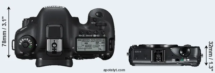 An illustration of the physical size and weight of the Canon 7D II and the Canon M is provided in the side-by-side display below. The two cameras are presented according to their relative size. Three consecutive views from the front, the top, and the rear side are shown. All width, height and depth dimensions are rounded to the nearest millimeter.