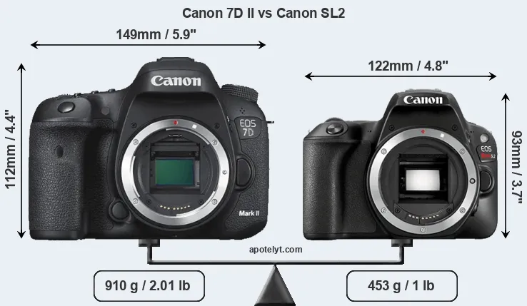 The physical size and weight of the Canon 7D II and the Canon SL2 are illustrated in the side-by-side display below. The two cameras are presented according to their relative size. Three consecutive perspectives from the front, the top, and the back are available. All width, height and depth dimensions are rounded to the nearest millimeter.