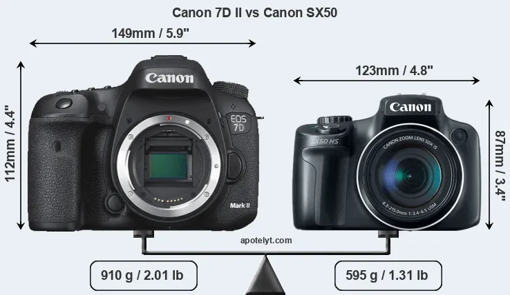 An illustration of the physical size and weight of the Canon 7D II and the Canon SX50 is provided in the side-by-side display below. The two cameras are presented according to their relative size. Three consecutive views from the front, the top, and the rear side are shown. All width, height and depth measures are rounded to the nearest millimeter.