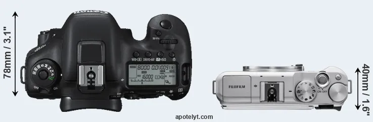 The physical size and weight of the Canon 7D II and the Fujifilm X-A5 are illustrated in the side-by-side display below. The two cameras are presented according to their relative size. Three consecutive views from the front, the top, and the rear side are shown. All size dimensions are rounded to the nearest millimeter.