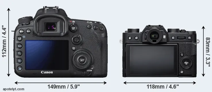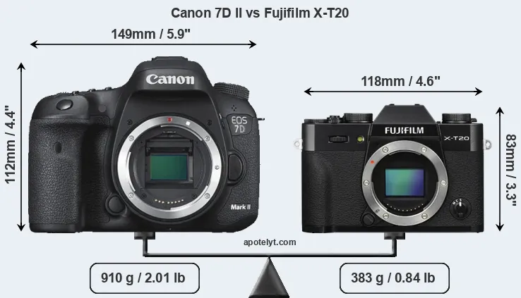 The side-by-side display below illustrates the physical size and weight of the Canon 7D II and the Fujifilm X-T20. The two cameras are presented according to their relative size. Three consecutive perspectives from the front, the top, and the back are available. All width, height and depth measures are rounded to the nearest millimeter.