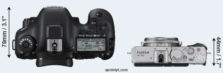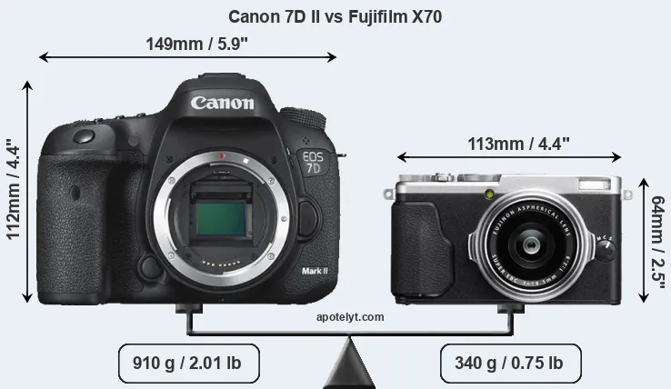 An illustration of the physical size and weight of the Canon 7D II and the Fujifilm X70 is provided in the side-by-side display below. The two cameras are presented according to their relative size. Three consecutive perspectives from the front, the top, and the back are available. All width, height and depth measures are rounded to the nearest millimeter.
