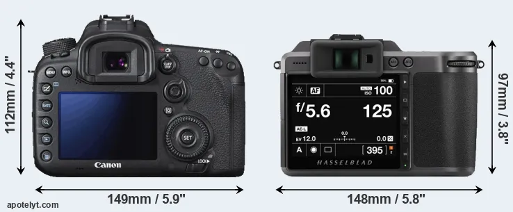 The physical size and weight of the Canon 7D II and the Hasselblad X1D II are illustrated in the side-by-side display below. The two cameras are presented according to their relative size. Three successive views from the front, the top, and the rear are shown. All width, height and depth measures are rounded to the nearest millimeter.