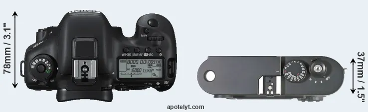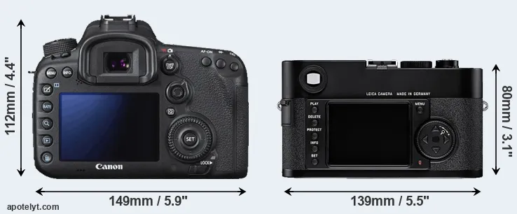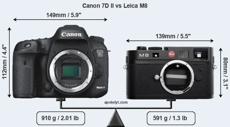 The physical size and weight of the Canon 7D II and the Leica M8 are illustrated in the side-by-side display below. The two cameras are presented according to their relative size. Three consecutive perspectives from the front, the top, and the back are available. All size dimensions are rounded to the nearest millimeter.