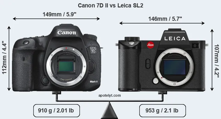 The side-by-side display below illustrates the physical size and weight of the Canon 7D II and the Leica SL2. The two cameras are presented according to their relative size. Three consecutive views from the front, the top, and the rear side are shown. All width, height and depth measures are rounded to the nearest millimeter.