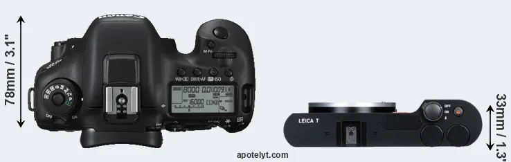 The side-by-side display below illustrates the physical size and weight of the Canon 7D II and the Leica T. The two cameras are presented according to their relative size. Three consecutive perspectives from the front, the top, and the back are available. All width, height and depth measures are rounded to the nearest millimeter.