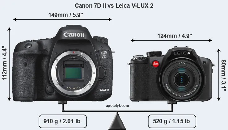 If the front view area (width x height) of the cameras is taken as an aggregate measure of their size, the Leica V-LUX 2 is considerably smaller (41 percent) than the Canon 7D II. It is worth mentioning in this context that the 7D Mark II is splash and dust resistant, while the V-LUX 2 does not feature any corresponding weather-sealing.