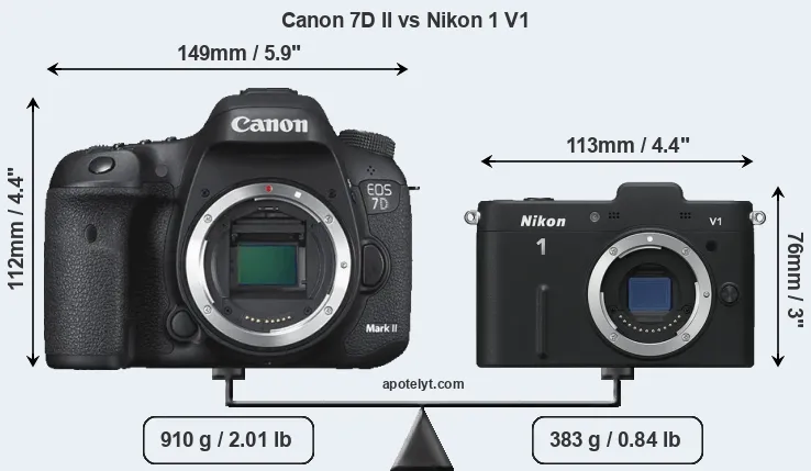 An illustration of the physical size and weight of the Canon 7D II and the Nikon 1 V1 is provided in the side-by-side display below. The two cameras are presented according to their relative size. Three successive views from the front, the top, and the rear are shown. All width, height and depth dimensions are rounded to the nearest millimeter.