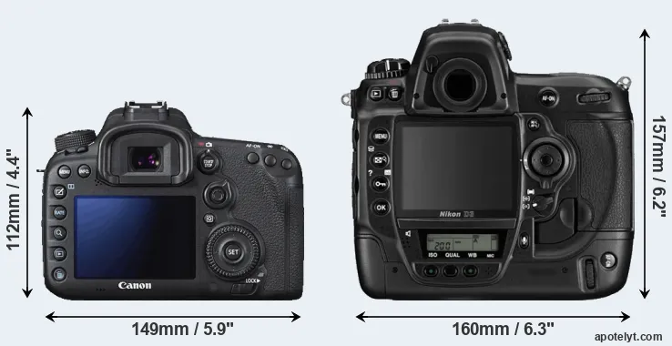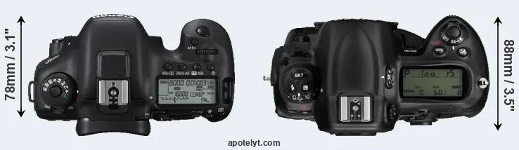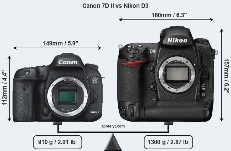 The physical size and weight of the Canon 7D II and the Nikon D3 are illustrated in the side-by-side display below. The two cameras are presented according to their relative size. Three consecutive views from the front, the top, and the rear side are shown. All size dimensions are rounded to the nearest millimeter.