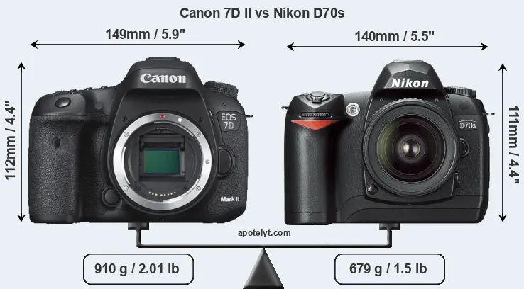 If the front view area (width x height) of the cameras is taken as an aggregate measure of their size, the Nikon D70s is notably smaller (7 percent) than the Canon 7D II. Moreover, the D70s is markedly lighter (25 percent) than the 7D Mark II. It is worth mentioning in this context that the 7D Mark II is splash and dust resistant, while the D70s does not feature any corresponding weather-sealing.