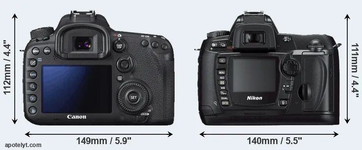 The physical size and weight of the Canon 7D II and the Nikon D70s are illustrated in the side-by-side display below. The two cameras are presented according to their relative size. Three consecutive views from the front, the top, and the rear side are shown. All size dimensions are rounded to the nearest millimeter.