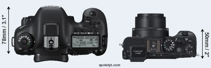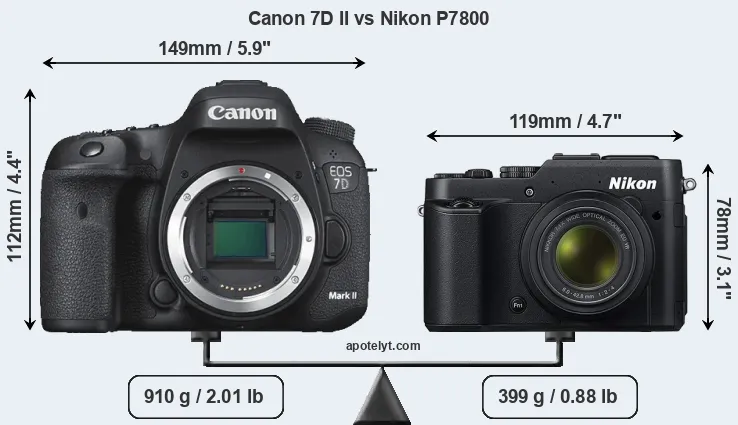 The physical size and weight of the Canon 7D II and the Nikon P7800 are illustrated in the side-by-side display below. The two cameras are presented according to their relative size. Three consecutive perspectives from the front, the top, and the back are available. All width, height and depth measures are rounded to the nearest millimeter.