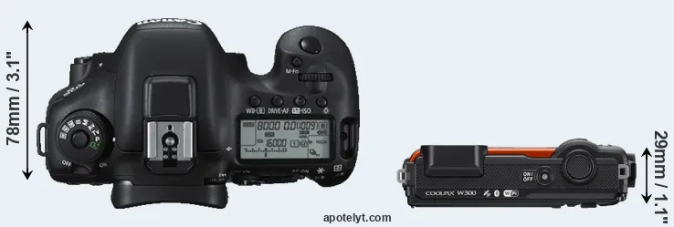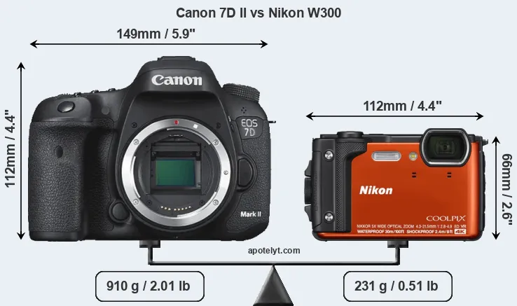An illustration of the physical size and weight of the Canon 7D II and the Nikon W300 is provided in the side-by-side display below. The two cameras are presented according to their relative size. Three consecutive views from the front, the top, and the rear side are shown. All width, height and depth dimensions are rounded to the nearest millimeter.