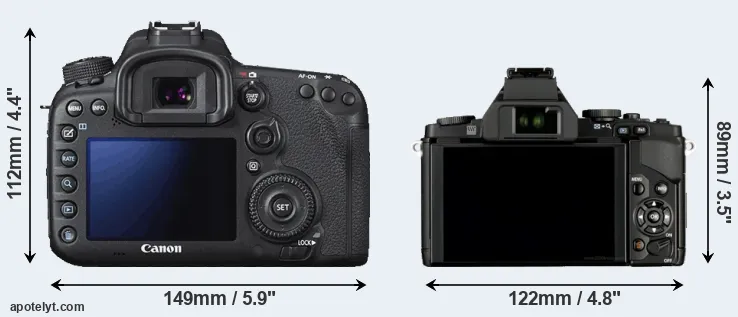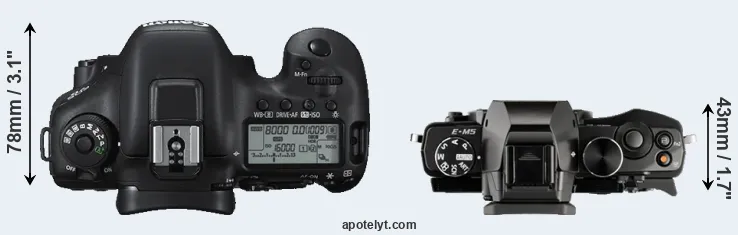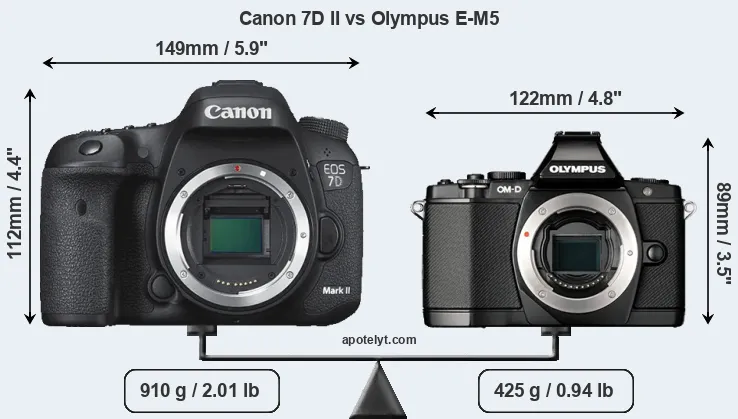 The physical size and weight of the Canon 7D II and the Olympus E-M5 are illustrated in the side-by-side display below. The two cameras are presented according to their relative size. Three consecutive perspectives from the front, the top, and the back are available. All width, height and depth dimensions are rounded to the nearest millimeter.