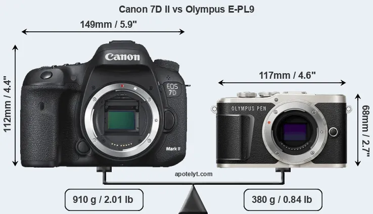 The physical size and weight of the Canon 7D II and the Olympus E-PL9 are illustrated in the side-by-side display below. The two cameras are presented according to their relative size. Three consecutive views from the front, the top, and the rear side are shown. All width, height and depth measures are rounded to the nearest millimeter.