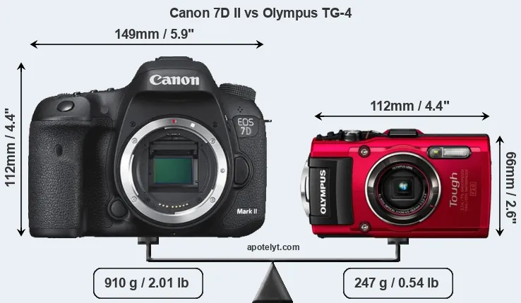 The above size and weight comparisons are to some extent incomplete and possibly misleading, as the TG-4 has a lens built in, whereas the 7D Mark II is an interchangeable lens camera that requires a separate lens. Attaching the latter will add extra weight and bulk to the setup. You can compare the optics available for the 7D Mark II and their specifications in the Canon EF Lens Catalog.