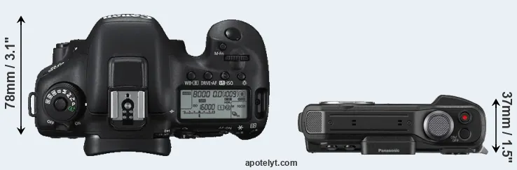 The side-by-side display below illustrates the physical size and weight of the Canon 7D II and the Panasonic TS7. The two cameras are presented according to their relative size. Three consecutive perspectives from the front, the top, and the back are available. All width, height and depth measures are rounded to the nearest millimeter.