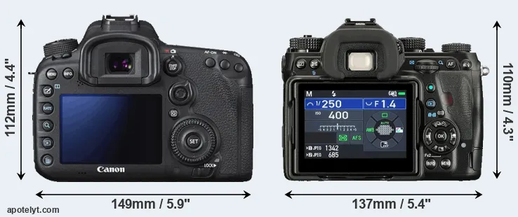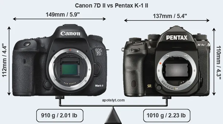 The physical size and weight of the Canon 7D II and the Pentax K-1 II are illustrated in the side-by-side display below. The two cameras are presented according to their relative size. Three consecutive perspectives from the front, the top, and the back are available. All width, height and depth dimensions are rounded to the nearest millimeter.
