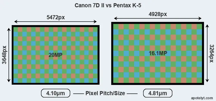 Despite having a smaller sensor, the Canon 7D II offers a higher resolution of 20 megapixels, compared with 16.1 MP of the Pentax K-5. This megapixels advantage comes at the cost of a higher pixel density and a smaller size of the individual pixel (with a pixel pitch of 4.10μm versus 4.81μm for the K-5). However, it should be noted that the 7D Mark II is much more recent (by 3 years and 11 months) than the K-5, and its sensor will have benefitted from technological advances during this time that make it possible to gather light more efficiently.