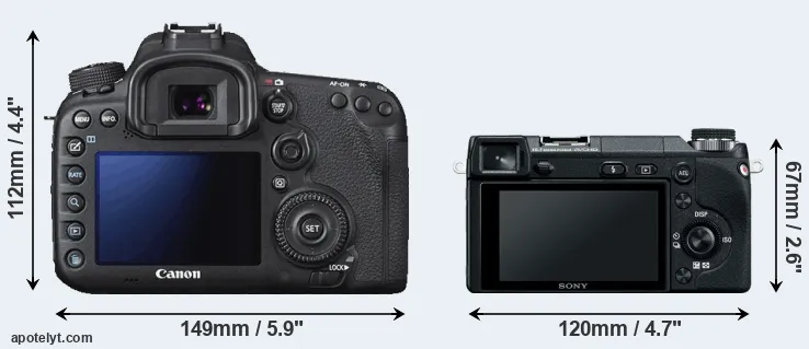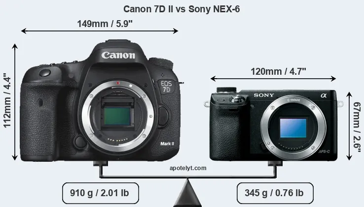If the front view area (width x height) of the cameras is taken as an aggregate measure of their size, the Sony NEX-6 is considerably smaller (52 percent) than the Canon 7D II. Moreover, the NEX-6 is substantially lighter (62 percent) than the 7D Mark II. It is worth mentioning in this context that the 7D Mark II is splash and dust resistant, while the NEX-6 does not feature any corresponding weather-sealing.