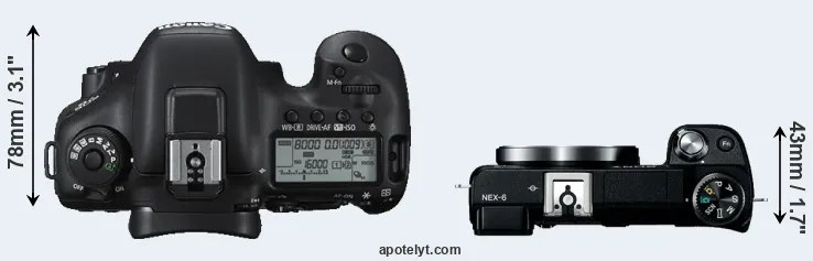An illustration of the physical size and weight of the Canon 7D II and the Sony NEX-6 is provided in the side-by-side display below. The two cameras are presented according to their relative size. Three consecutive views from the front, the top, and the rear side are shown. All width, height and depth measures are rounded to the nearest millimeter.