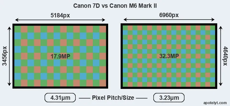 With 32.3MP, the M6 Mark II offers a higher resolution than the 7D (17.9MP), but the M6 Mark II has smaller individual pixels (pixel pitch of 3.23μm versus 4.31μm for the 7D). Yet, the M6 Mark II is a much more recent model (by 9 years and 11 months) than the 7D, and its sensor will have benefitted from technological advances during this time that enhance the light gathering capacity of its pixel-units.