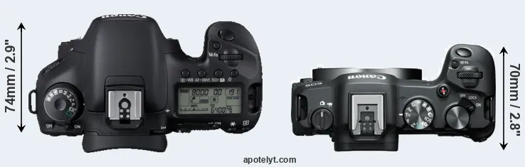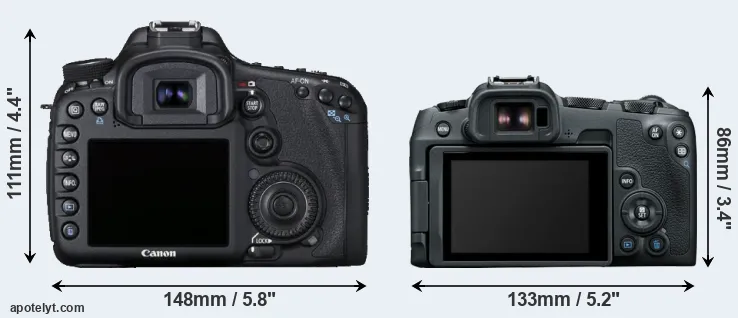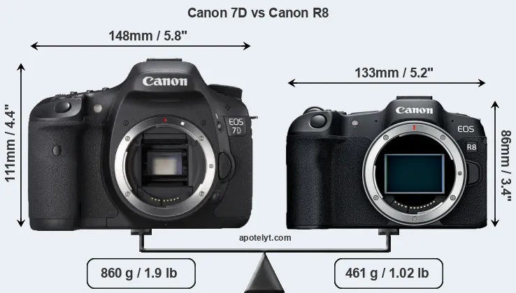 The side-by-side display below illustrates the physical size and weight of the Canon 7D and the Canon R8. The two cameras are presented according to their relative size. Three consecutive views from the front, the top, and the rear side are shown. All width, height and depth measures are rounded to the nearest millimeter.